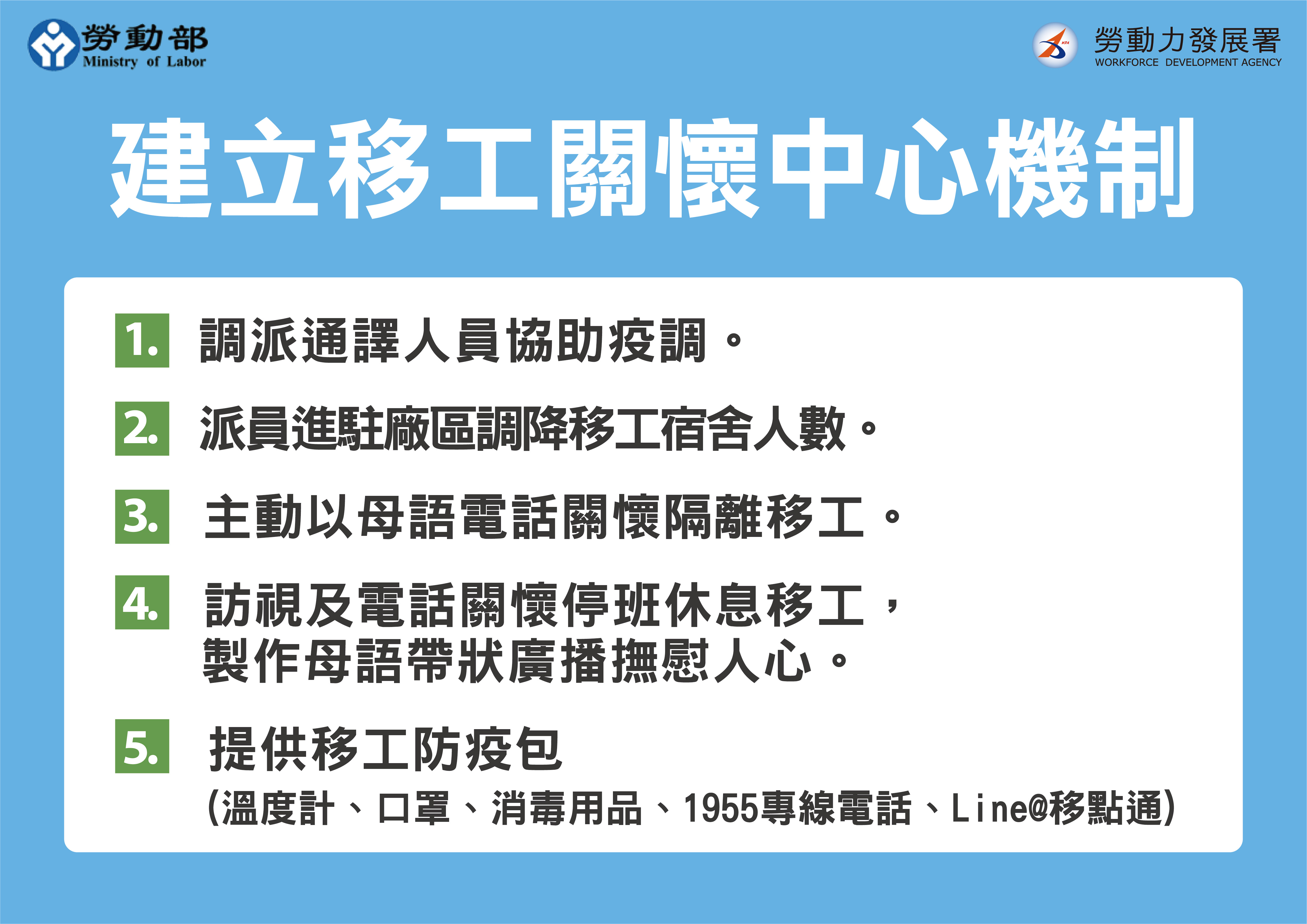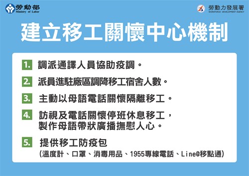 二、實地關懷移工給予支持:自6月6日起,派駐雙語人員於前進指揮所,協助疫調翻譯,並每日早晚放送廣播關懷移工、關懷每日健康監測狀況,並啟動隔離移工關懷機制,由1955專線雙語人員主動電話關懷隔離移工情緒給予心理支持,及提供防疫包(溫度計、口罩、消毒用品、家鄉零食、1955專線電話、Line@移點通)。