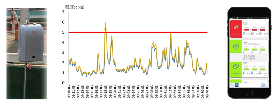 目前勞安所開發之作業環境有害物智慧監測技術,經過多場實際場域驗證,透過感測裝置連續偵測之特性,可即時發現製程中揮發性有機物質因逸散而造成濃度上升趨勢,輔助事業單位掌握作業環境有害物濃度變化趨勢,及進行工程控制改善;另針對短時間高濃度暴露特性之作業型態,藉由感測裝置連續監測之輔助,偵測短時間作業勞工之任何時間的實際暴露濃度,當超過最高容許濃度之規範,系統自動發送警示訊息(如圖2),勞安人員可立即透過應用程式掌握異常狀況,進行事故排除,避免危害擴大。