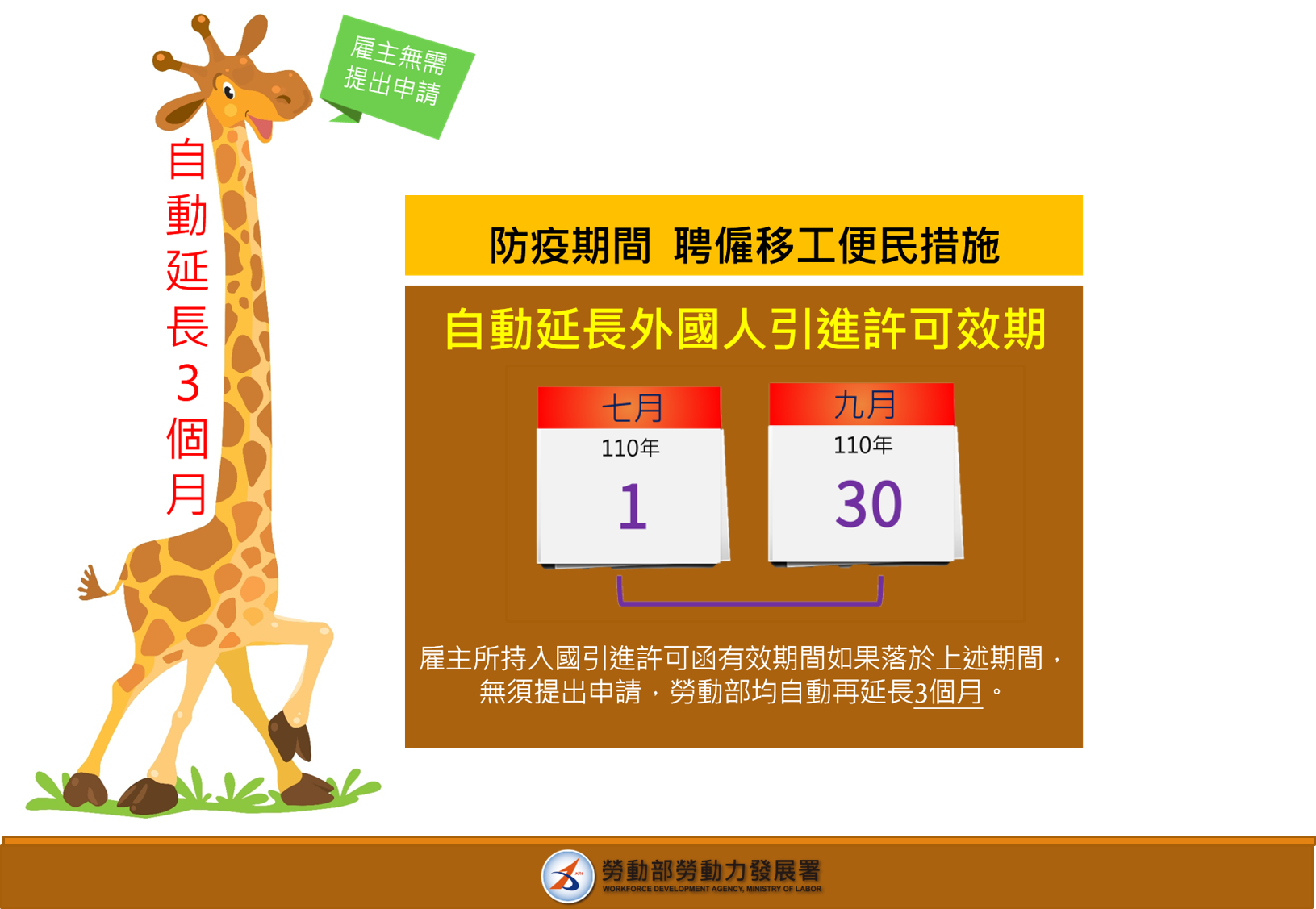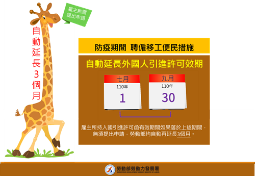 (一) 自動延長具入國引進效力的許可:基於便民及簡化行政作業,勞動部目前已針對雇主所持具入國引進效力的各類許可函,如於110年5月19日至110年6月30日止期間內效期屆滿,均已自動延長3個月效期,雇主無須再提出申請。該項便民措施將延長為110年9月30日前效期屆滿者,均可適用自動延長3個月效期。