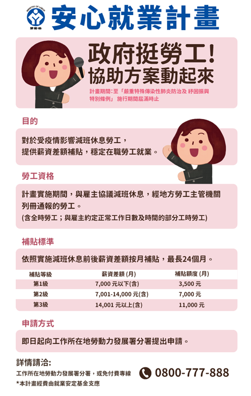此外,勞動部為了穩定勞工就業狀況,針對採取協議減班休息策略維持營運的事業單位勞工,推動「安心就業計畫」,除了在110年6月9日提高補貼月數為24個月之外,依「從寬、從優、從速」的原則,將自110年7月1日起,將補貼額度由原來的薪資差額50%,調整為「三級定額補貼」,依勞工薪資減損程度,每人每月分別補貼3,500元、7,000元或1萬1,000元,除簡化補貼作業之外,也提高每人可以領得的補貼額度,擴大對減班休息勞工的生活協助。