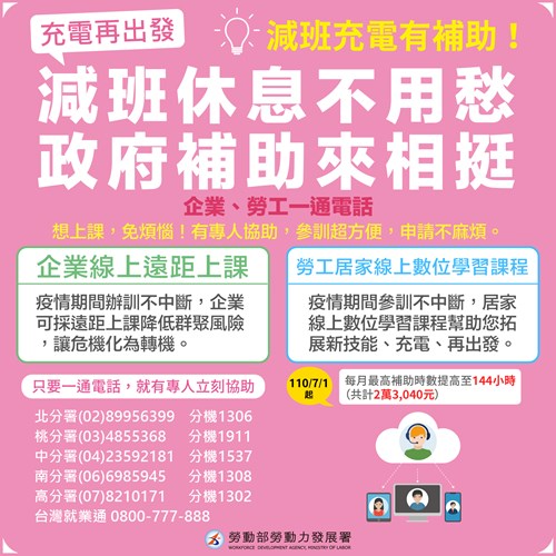 勞動部表示,「充電再出發訓練計畫」及「安心就業計畫」針對疫情擴大補助的辦理期間,至《嚴重特殊傳染性肺炎防治及紓困振興特別條例》施行期間屆滿之日止(111年6月30日),凡是經勞資協議實施減班休息並通報地方勞工主管機關的勞工或事業單位,可撥打免付費客服專線0800-777-888,由專人提供諮詢服務,亦可至勞動部「疫情紓困專區」(https://www.mol.gov.tw/topic/44761/48532/)、補助企業辦理員工訓練計畫網(https://onjobtraining.wda.gov.tw/)查詢相關資訊,或電洽勞動部勞動力發展署所屬分署,以瞭解更多申請資訊。各分署聯絡資訊如下: