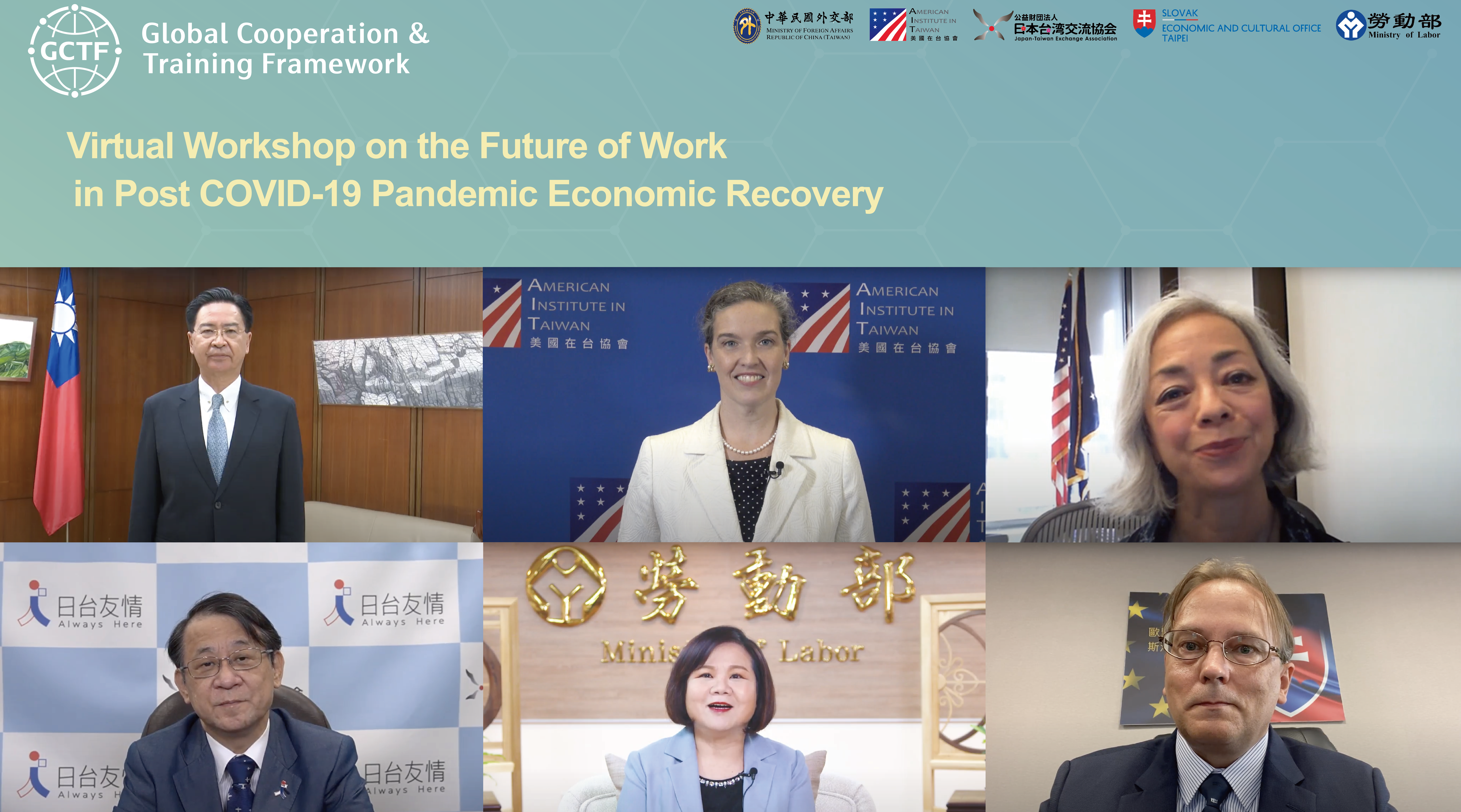 勞動部於今年9月9日至10日與外交部、美國在台協會(AIT)、日本台灣交流協會(JTEA)、美國勞工部(USDOL)及斯洛伐克經濟文化辦事處(SECO),首度在「全球合作暨訓練架構(Global Cooperation and Training Framework)」以勞動權益為主題,共同辦理「COVID-19後疫情時期經濟復甦之『未來工作』」線上工作坊,透過視訊方式向與會國家代表分享,臺灣如何因應「未來工作」的寶貴經驗,這也是勞動部首次與美國勞工部在GCTF的共同合作。