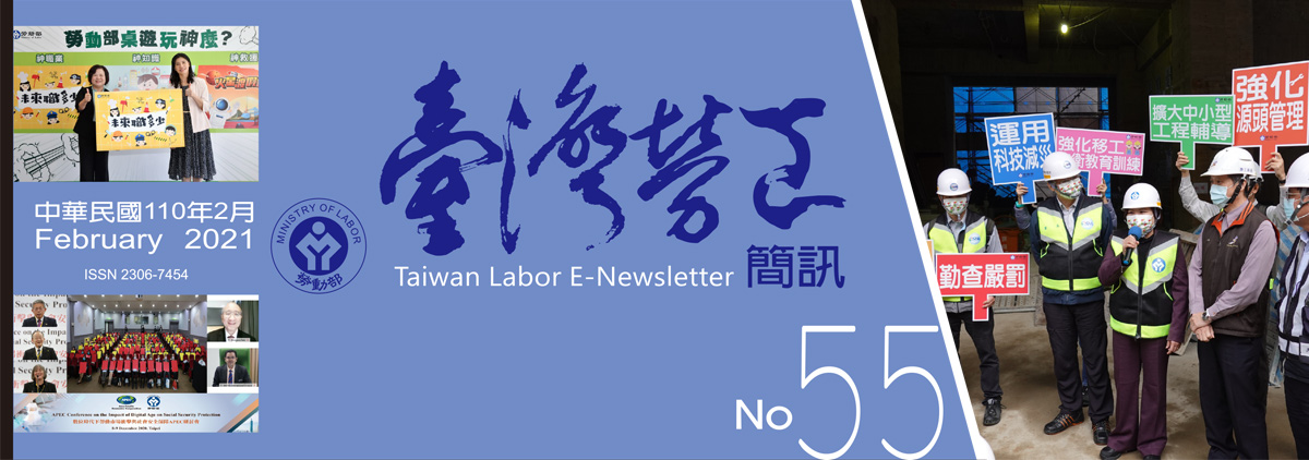 - 新聞瞭望 勞動部結合遠距視訊與實體參與,邀請APEC經濟體共同在臺北舉辦「數位時代下勞動市場衝擊與社會安全保障」APEC研討會 勞動部推動多元勞動教育,用「桌遊」建立學生勞動權益觀念 勞動部許銘春部長率隊檢查營造工地,啟動營造業減災加強年
